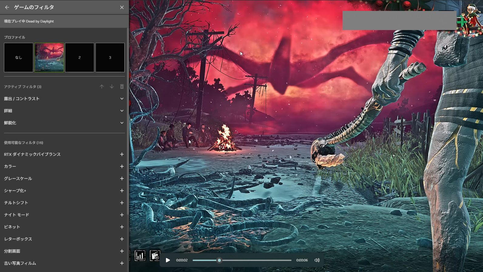 NVIDIA AppやReshadeなどの外部ツールを用いて、ゲーム内の明るさを設定します。 これらのツールはDBDが公式に利用を許可しているため、使用しても問題ありません。