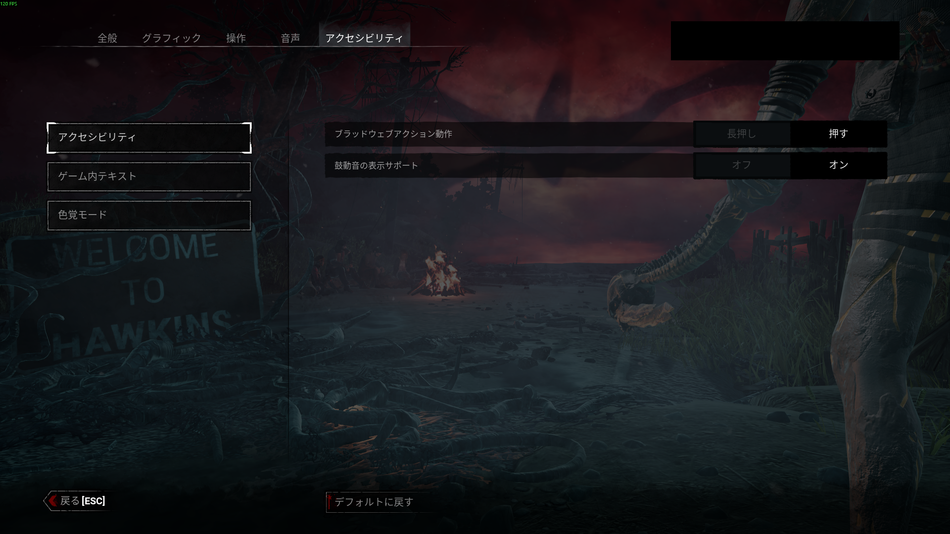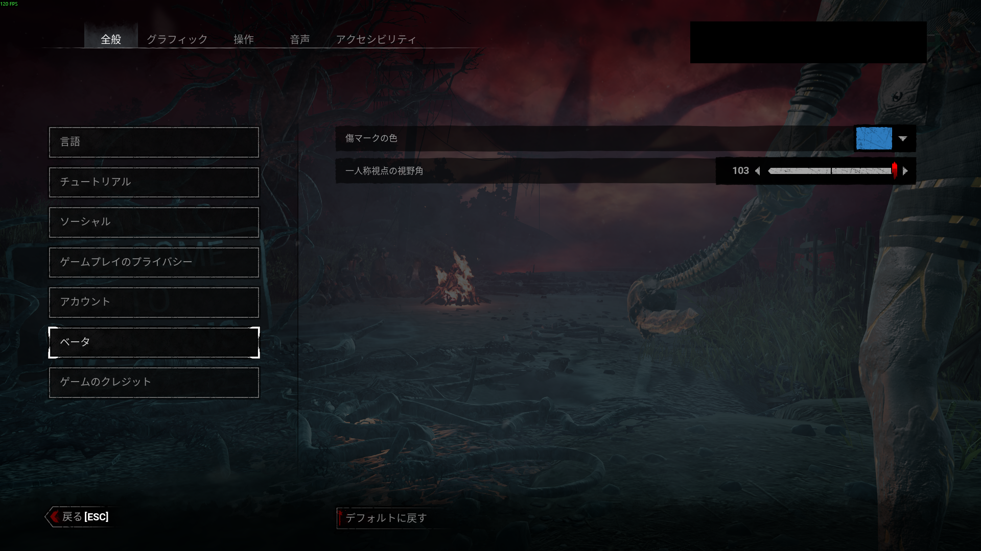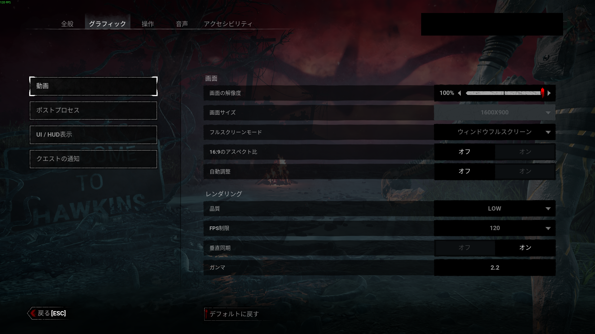 高性能なPCを使っている場合を除いて、なるべく高いFPSを維持するため、画質を落とすのがおすすめです。 そして、FPSは上限の120に設定するのが良いです。目で見た感じでは60FPSとあまり変わらなくても、サバイバーの場合スキルチェックの成功率が高くなります。また、キラーの場合は、サバイバーの旋回に対応しやすくなるなど、確実なメリットがあります。